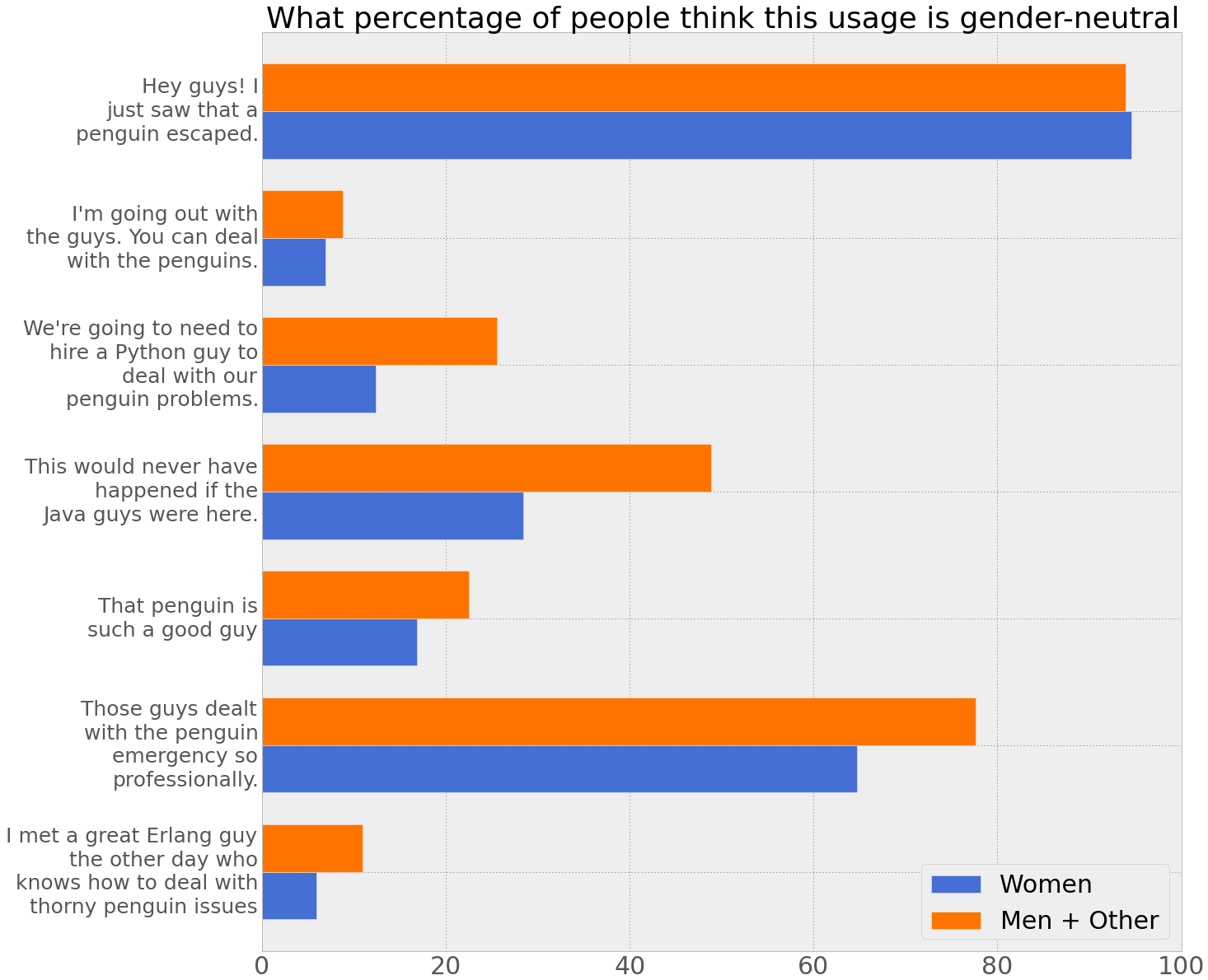 Several people told me that they thought that “guys” was a totally gender-neutral term and were surprised by their results when they took the survey. Awesome! A++ would survey again.